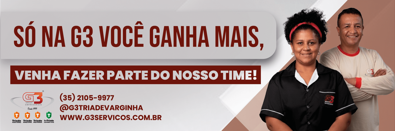 A G3 é uma empresa especializada no segmento de prestação de serviços terceirizados. Desde 1999, desenvolve um trabalho ético e eficiente que se tornou referência em recursos para otimização de tempo, material e mão-de-obra qualificada para o mercado mineiro e paulista.